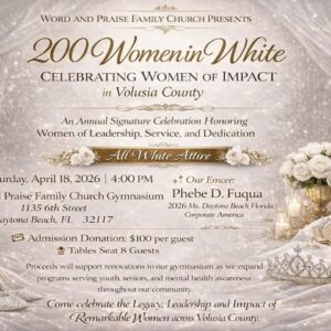 Word and Praise Family Church presents the 200 Women in White—an annual signature celebration honoring the leadership, service, and dedication of remarkable women across Volusia County. We are thrilled to announce our Emcee for the evening: Phebe D. Fuqua, 2026 Ms. Daytona Beach Florida Corporate America. Phebe continues her mission to “Inspire to Change and […]